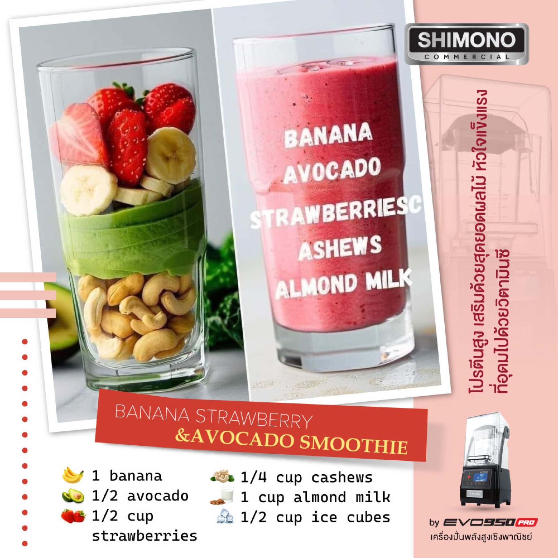 ใครที่กำลังมองหาเครื่องดื่มเพื่อสุขภาพที่ทั้งอร่อยและอิ่มท้อง สมูทตี้เข้มจากกล้วย อโวคาโด สตรอเบอร์รี เม็ดมะม่วงหิมพานต์ และนมอัลมอนด์ คือคำตอบที่คุณกำลังตามหาค่ะ สูตรนี้รวมเอาสุดยอดวัตถุดิบที่มีประโยชน์ต่อสุขภาพมาไว้ด้วยกัน ไม่ว่าจะเป็นใยอาหาร โปรตีน วิตามิน และแร่ธาตุต่างๆ ที่ร่างกายต้องการ