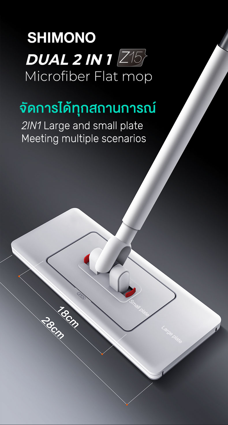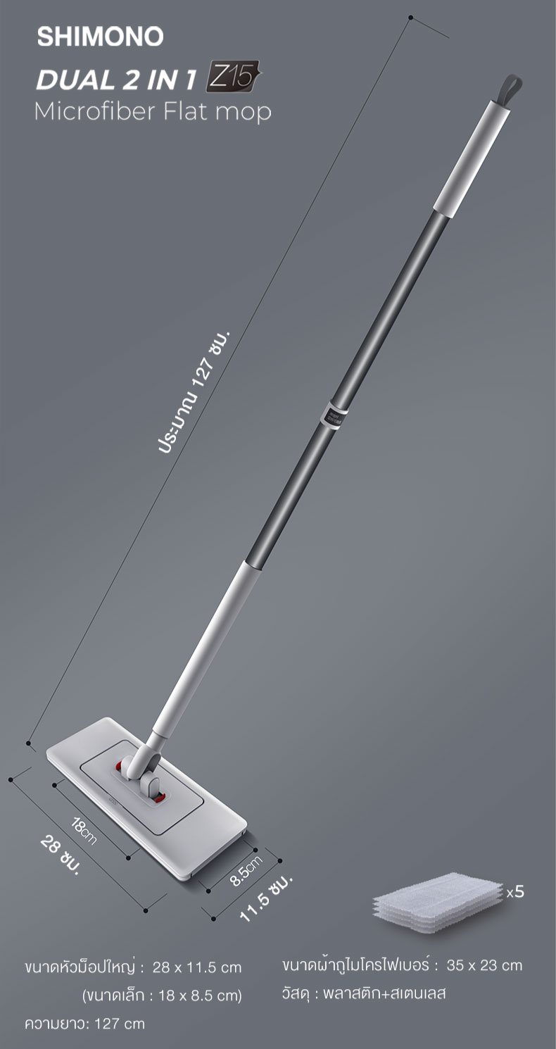 ไม้ถูพื้น SHIMONO Z15 ถูกออกแบบมาเพื่อแก้ปัญหาการทำความสะอาดที่ยุ่งยากและต้องใช้อุปกรณ์หลายชิ้นในอดีต แทนที่จะต้องมีไม้ถูพื้นหลายขนาดสำหรับพื้นที่ที่แตกต่างกัน Z15 ได้รวมทุกอย่างไว้ในด้ามเดียว