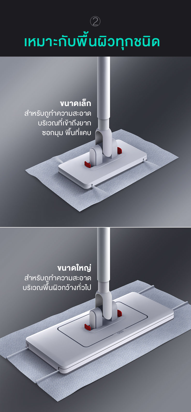 Small plate (ขนาดเล็ก): สามารถปรับขนาดให้เล็กลงเหลือ 18 เซนติเมตรได้อย่างง่ายดาย เพียงแค่ปลดล็อกกลไกสีแดง เหมาะสำหรับทำความสะอาดในพื้นที่แคบ ซอกเล็กๆ มุมอับ หรือบริเวณที่มีเฟอร์นิเจอร์วางอยู่เยอะ เช่น ใต้โซฟา, ใต้ตู้, ซอกข้างเตียง หรือในห้องน้ำ