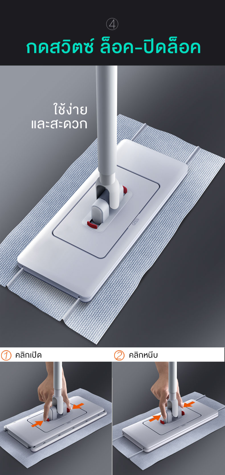 การออกแบบที่ทันสมัยและใช้งานง่าย: ตัวด้ามและหัวม็อบมีดีไซน์ที่เรียบง่ายแต่ทันสมัย ผลิตจากวัสดุที่ดูแข็งแรงทนทาน กลไกการปรับขนาดถูกออกแบบมาให้ใช้งานสะดวกด้วยสลักสีแดงที่มองเห็นได้ชัดเจน