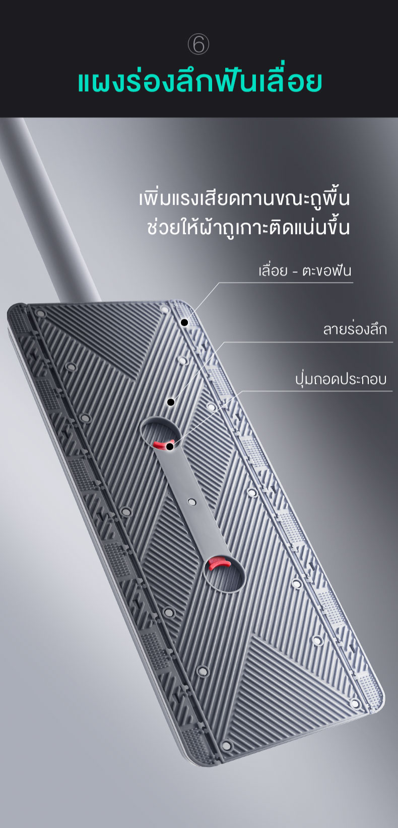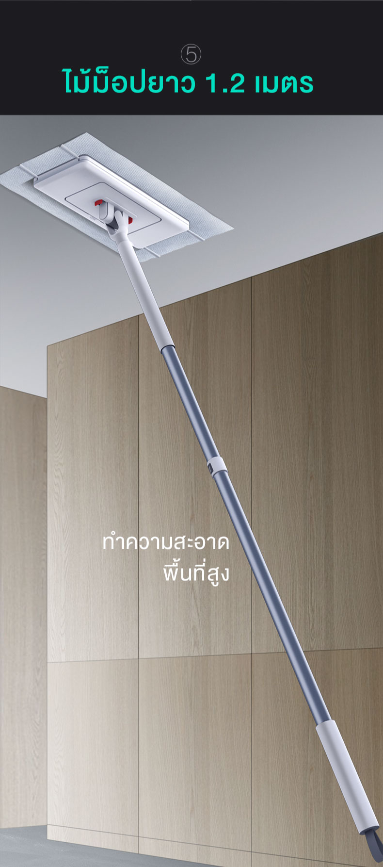 ความคล่องตัวสูงสุด: หัวม็อบที่ปรับได้และหมุนได้อิสระ ช่วยให้เข้าถึงได้แม้ในจุดที่ยากที่สุด เช่น ใต้โต๊ะทำงาน หรือรอบขาเก้าอี้ ทำให้การทำความสะอาดครอบคลุมทุกตารางนิ้ว
